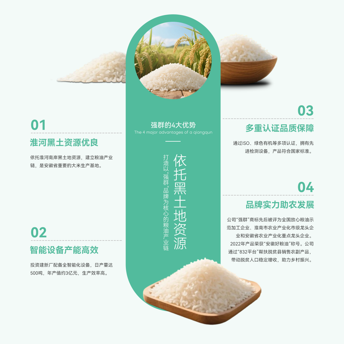 壽縣強群糧油貿易有限公司成立于2011年,座落在淮南市壽縣澗溝鎮,是一家集種植、加工、收儲、銷售于一體、以生產中、高檔質優、特色類大米為主的綜合性企業。公司依托準河南岸的黑土地資源,打造以“強群”品牌為核心的糧油產業鏈,是安徽省重要的大米生產基地。   為響應市場增長需求,公司2021年啟動二期擴產工程,其中新生產廠區建設投入資金近億元,建設現代化新生產線,總占地面積約4000...